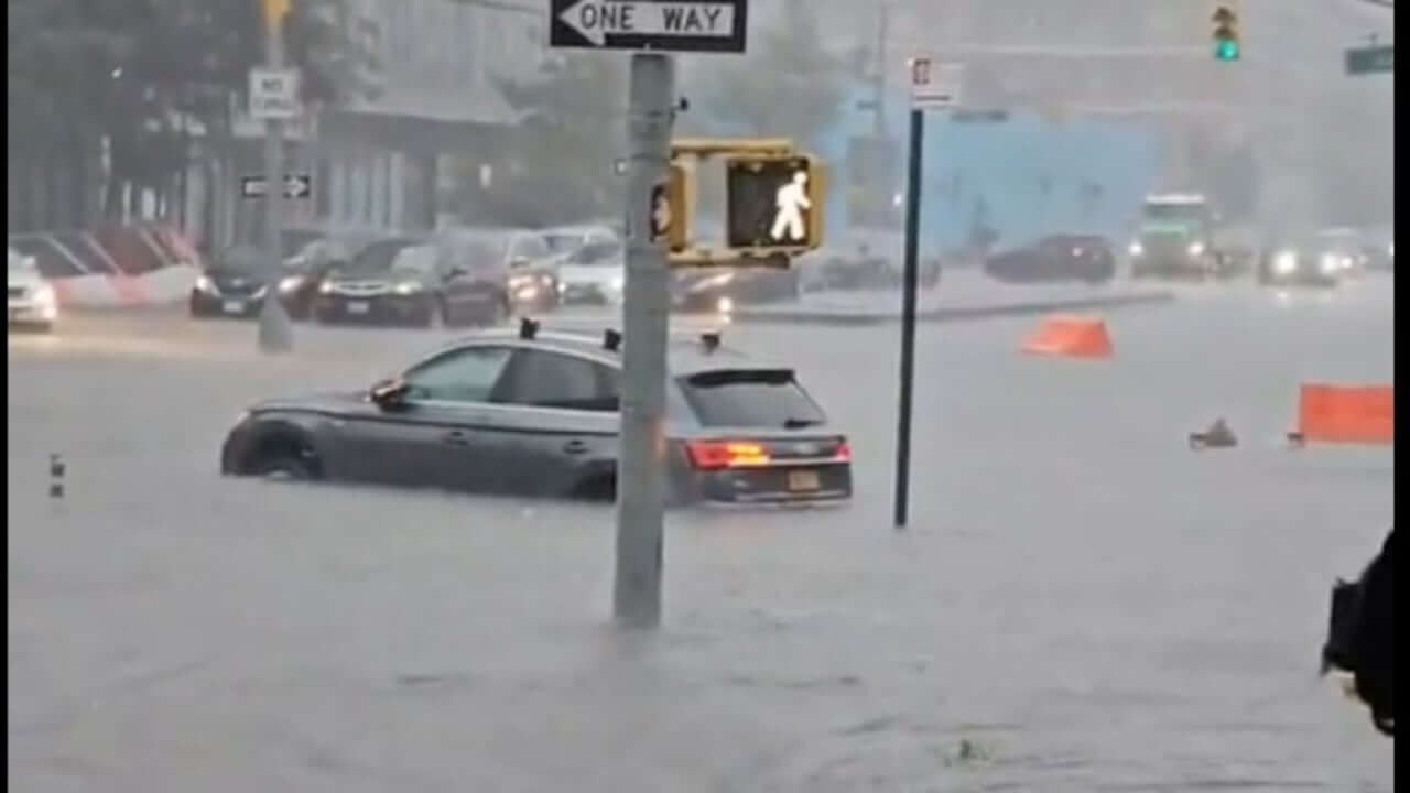 En paralelo, las lluvias anegaron calles y viviendas en toda la ciudad y vehículos, lo que provocó la interrupción del transporte público en la Gran Manzana.